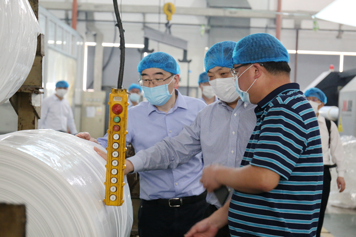 来访期间,中石化领导一行在韩新伟等陪同下考察了新光公司,参观了新光公司农膜生产车间、仓库,详细询问农膜产品的生产工艺流程、农膜生产、原料供应、库存储备情况,零距离了解中石化产品在生产一线的使用情况。